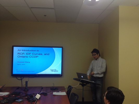 On the morning of April 5, 2014, Mr. Xiuquan Wang gave an interesting seminar on his latest research work on regional climate model to IEESC staff and students. The title of his presentation is “An Introduction to RCP, IDF Curves, and Ontario CCDP”. After his presentations, Mr. Wang had a thorough discussion with the audience about the potential research extensions.