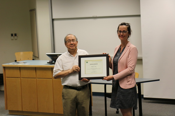 On the night of June 8, 2016, Dr. Qingyun Duan, the National Chair Professor and Chief Scientist at the College of Global Change and Earth System Sciences, Beijing Normal University, arrived in Regina and started his 2-day visit to IEESC. On June 10, Dr. Duan gave an interesting seminar entitled "Uncertainty quantification of complex dynamical models using UQ-PyL". After it, Dr. Duan had a thorough discussion with IEESC staff and students on his latest research and possible collaboration. He was very satisfied with the visit outcome and would like to conduct more research collaborations with IEESC in the future.