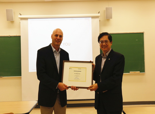 On October 9, 2018, Dr. Michael Tait arrived in Regina. Dr. Tait is Professor of Civil Engineering at McMaster University. He delivered a seminar entitled "Passive Control/ Protective Devices" to the University community. Afterwards, Dr. Tait had a thorough discussion with IEESC staff and students on his latest research and discussed possible collaborations. He was very satisfied with the visit outcome and plans to conduct more research collaborations with IEESC.