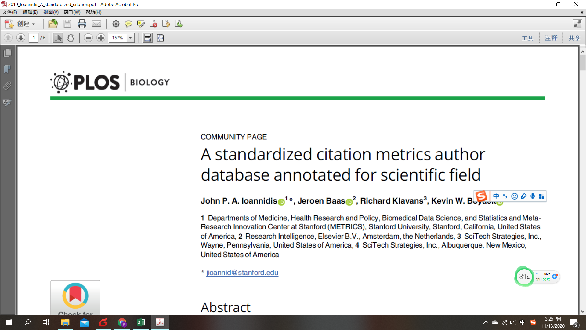 This world ranking of scientists was led by Stanford University, and focuses on the development of a composite indicator (c-score) for citation evaluation. The c-score is the sum of the standardized values of six log-transformed indicators, which are (1) total number of citations, (2) h-index, (3) Schreiber coauthorship-adjusted hm index, (4) number of citations to papers as a single author, (5) number of citations to papers as single or first author, and (6) number of citations to papers as single, first, or last author. The formula of the c-score can be found under Table 1 in the paper published in 2019.