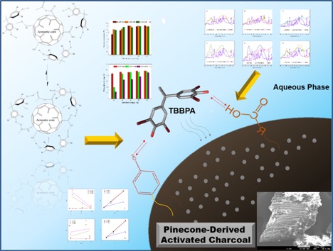 This figure shows that the main adsorption mechanism between TBBPA on pyrolyzed carbonaceous matherials is caused by the interaction of hydrogen bond, from the hydroxyle groups on both carbon surface and pollutants. This process can also be assisted by high surface areas and dense aromatic structures.
