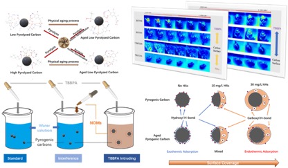 This figure shows the behaviors of TBBPA (a brominated flame retardant) on long-term pyrolyzed carbonaceous materials can have different adsorption mechanisms (with natural organic matters/pure water), indicating the involvement of natural organic matters cause variations in adsorption behaviors on aged/non-aged pyrolyzed carbonaceous materials.